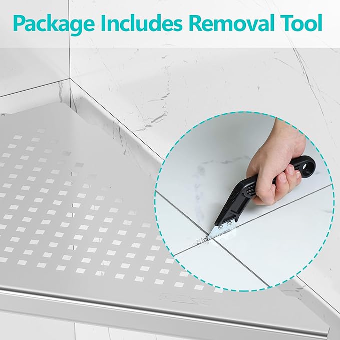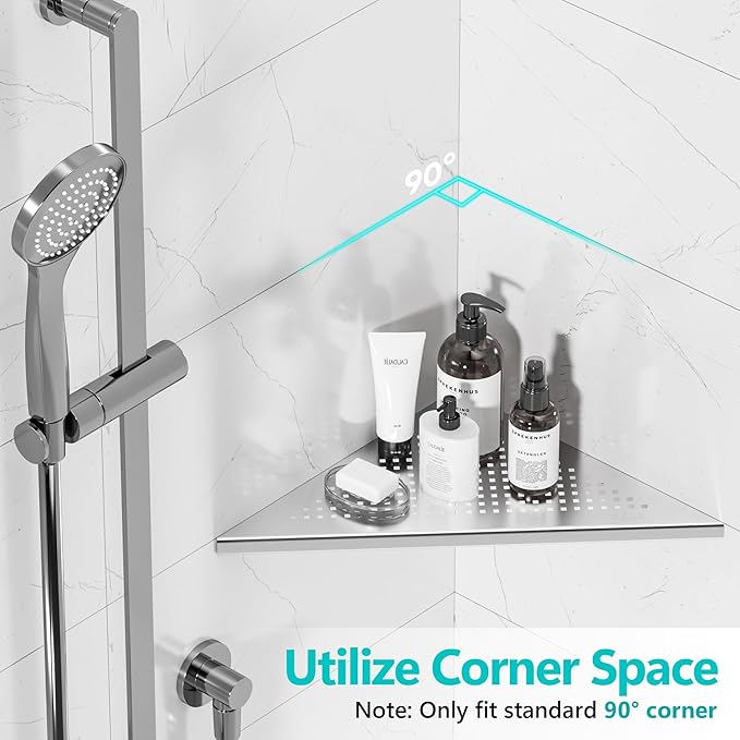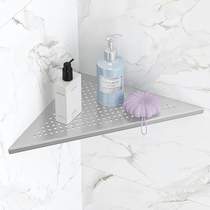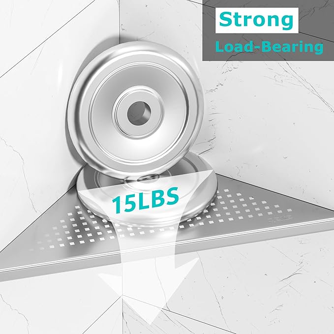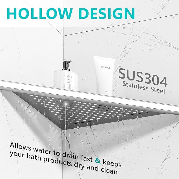 - 【Space Saving Wall Mount Corner Shelf】The triangle shaped shelf can optimize space and avoid sharp edges in your bathroom. Large capacity for holding shampoos, soaps, and many other bathroom essentials.