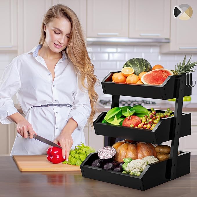 Bamboo 3 Tier Fruit Basket For Counter, Large Capacity Fruit Storage Countertop, Fruit Holder, Wooden Pantry Organizers and Storage, Kitchen Countertop Organizer With Two Banana Hangers (Black)