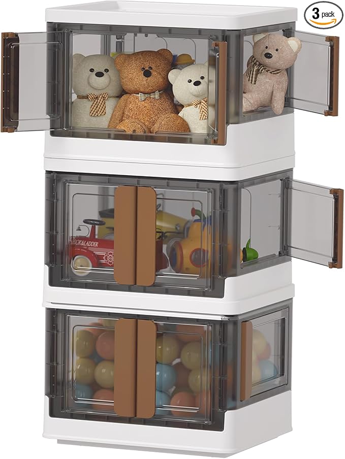 HAIXIN Closet Organizers and Storage, 4 Doors Opening Stackable Storage Box, 6.86 Gal Plastic Dorm Room Essentials, Folding Storage Container with Wheels, Cube Bins for Room Organizer, 3 Pack