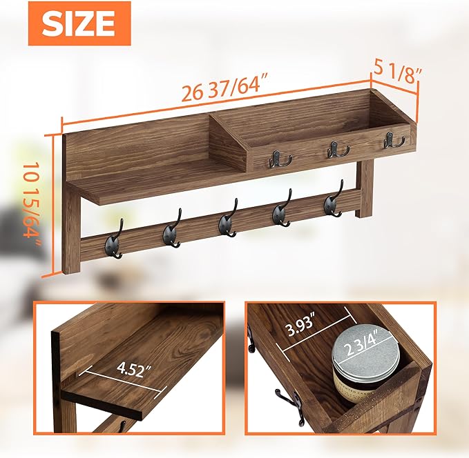 - Extra Space Saving Shelf And Key Hooks For Storage Solution: 26.57 x 5.12 inch at the top with ledge offers a large space for decorative gadgets or store stuff; You can not only use this wall coat rack to display plants, collections, or other home accessories but also display picture frames, Knick knack, plants, letters, postcards, keys, and so on
