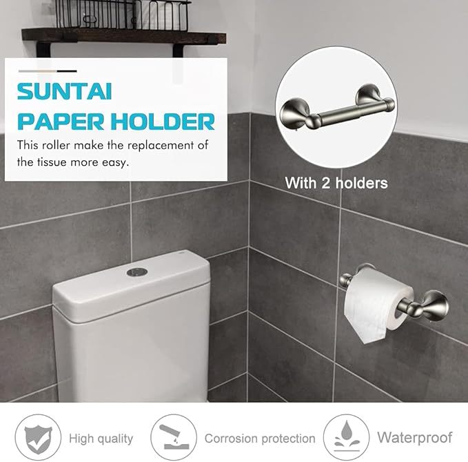 - Non-slip wall mounted bathroom hardware set, made from quality durable Zinc Alloy material which is waterproof, anti-corrosive and rust,durable and safety to use.The Spring Loaded Rod is made of quality plastic and fits for large toilet paper rolls