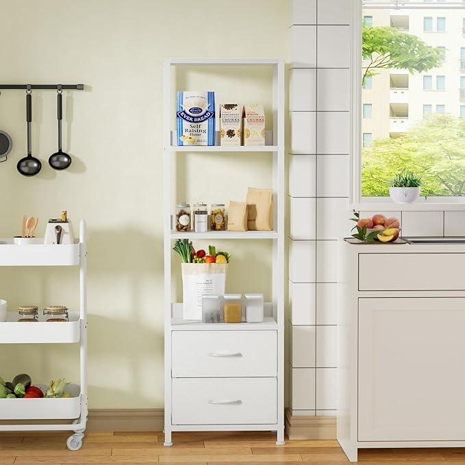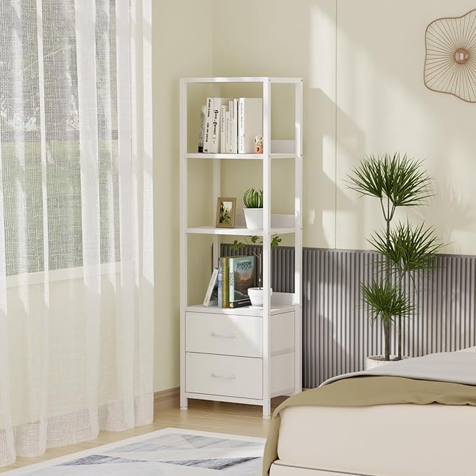 Furnulem 4-Tier Corner Shelf, Bookshelf with 2 Storage Drawers, 57.28”Tall Narrow Bookcase, Standing Shelf Organizer Unit for Living Room, Bedroom, Metal Frame, Wood Display Shelf
