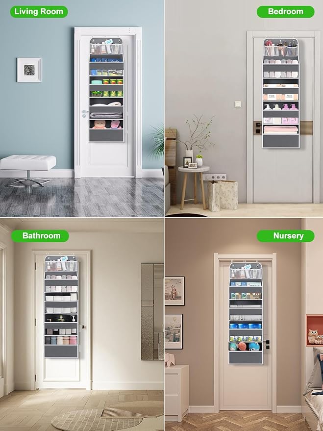 - Multi-functional Door Storage Organizer: This hanging door storage holder is suitable for Child's Room, Nursery, Bedroom, Bathroom, Kitchen, Laundry, Pantry, Office, It can store stuffed animals, diapers, Kid's shoes, socks, skin care products, towel, hair dryer, cosmetics and ect. Definitely a good pickup for anyone on a budget wanting to update organization and storage for extra storage