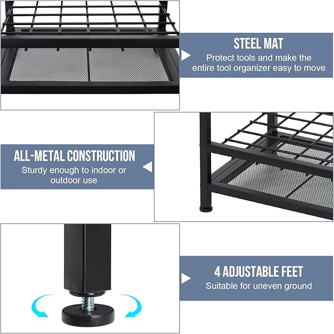 - Durable Heavy Duty Steel: This garage tool storage made of a durable coated steel frame that's sturdy enough to withstand indoor or outdoor use. In contrast to plastic tool rack, ours is constructed from the high quality steel, making it rust-resistant and corrosion-resistant.With steel mat to protect tools and make the entire tool organizer easy to move