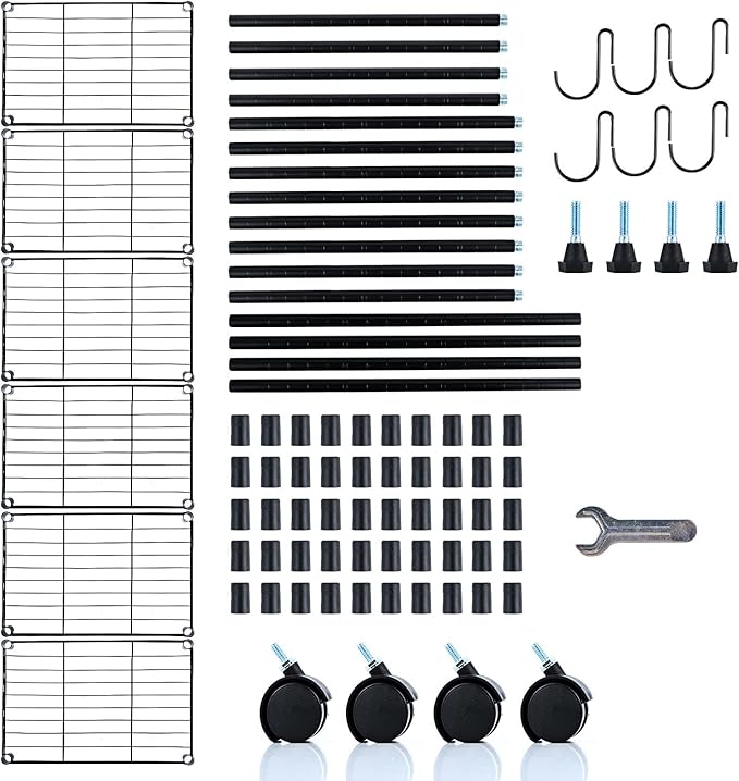 - Multifunction - 6-Shelf shelving unit is suitable for your kitchen, office, garage, bathroom and so forth. Wheels to move easily, convenient hooks to hang your items to add extra space