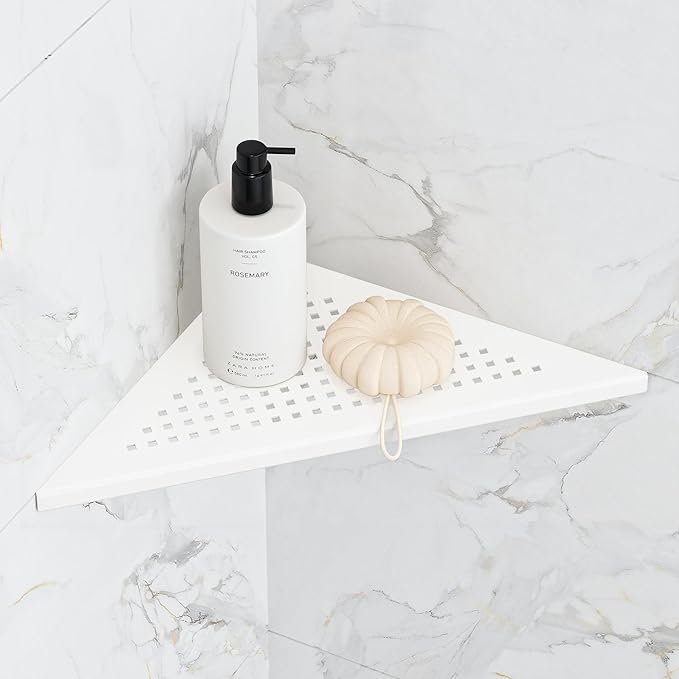 - 【Space Saving Wall Mount Corner Shelf】The triangle shaped shelf can optimize space and avoid sharp edges in your bathroom. Large capacity for holding shampoos, soaps, and many other bathroom essentials.