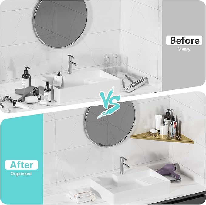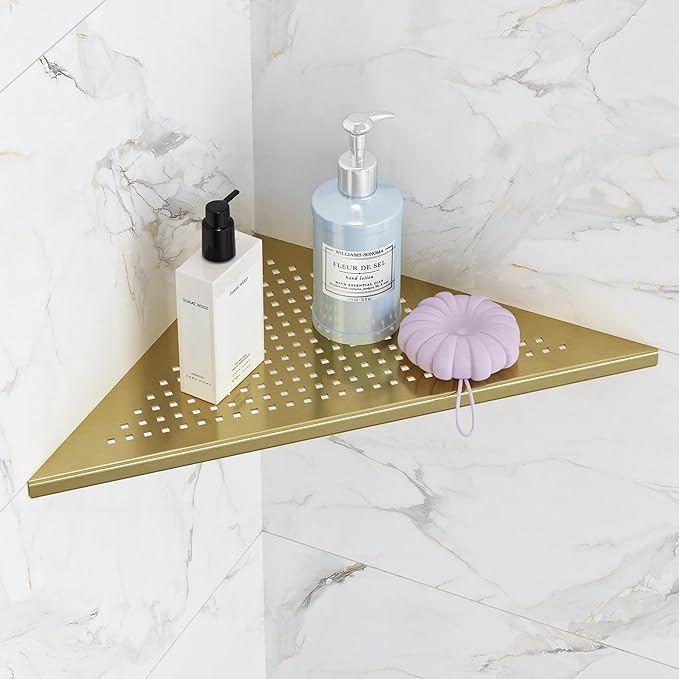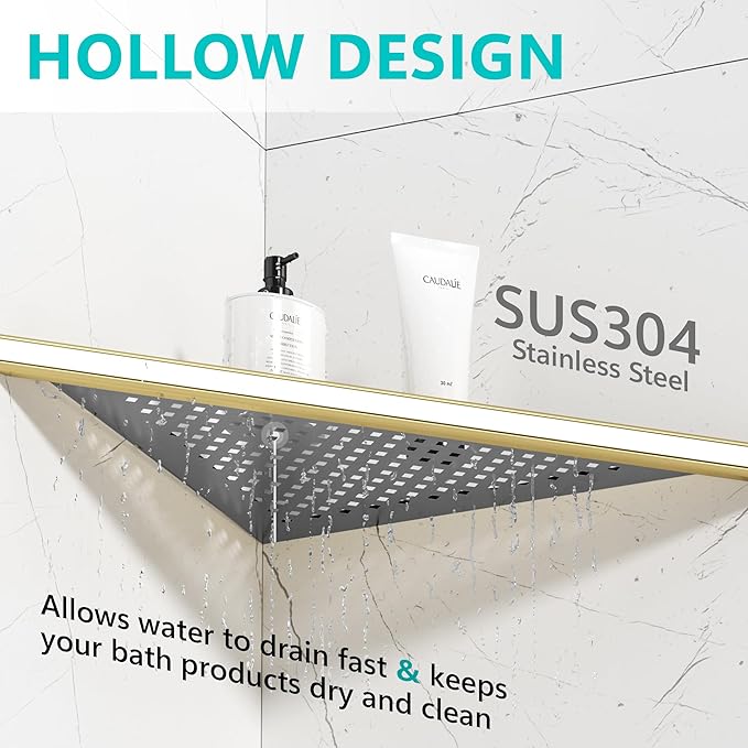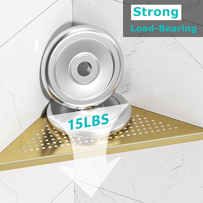 - 【Space Saving Wall Mount Corner Shelf】The triangle shaped shelf can optimize space and avoid sharp edges in your bathroom. Large capacity for holding shampoos, soaps, and many other bathroom essentials.