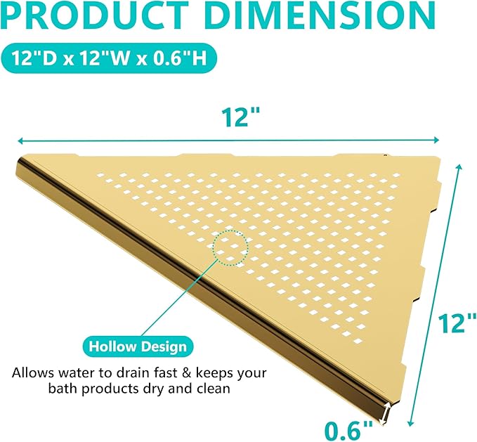 - 【Corner Bathroom Shelves】The dimension of each shower shelf corner is 12"D x 12"W x 0.6"H. Only works for 90 degree corner, and each tile shower shelf can easily hold your shower supplies up to 15bs.