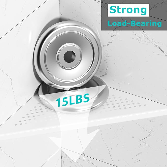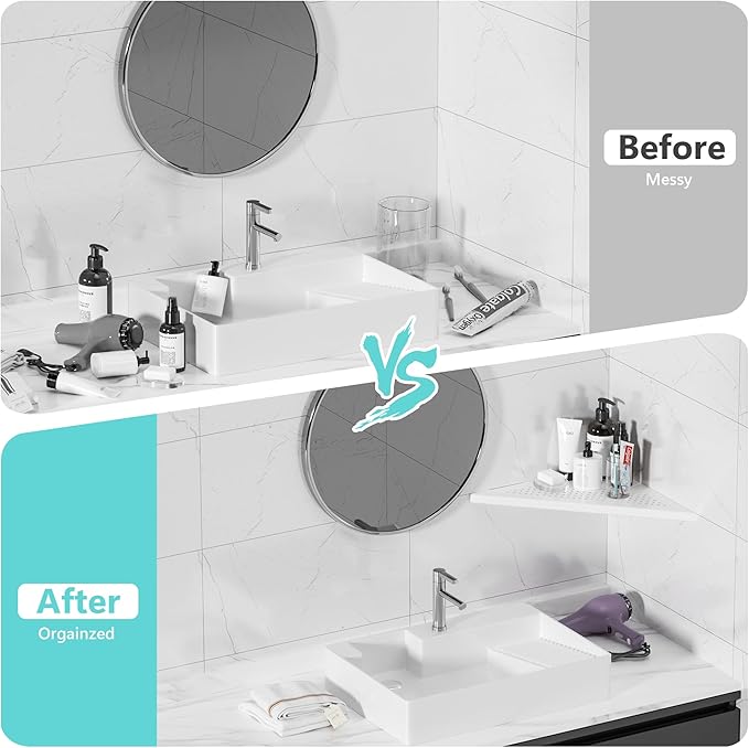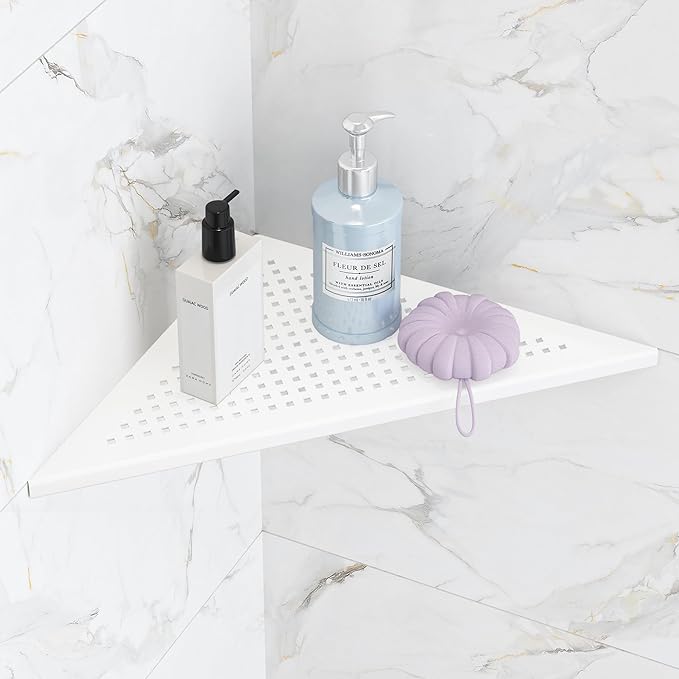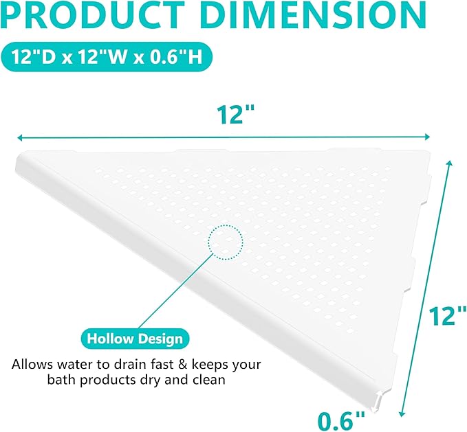 - 【Space Saving Wall Mount Corner Shelf】The triangle shaped shelf can optimize space and avoid sharp edges in your bathroom. Large capacity for holding shampoos, soaps, and many other bathroom essentials.
