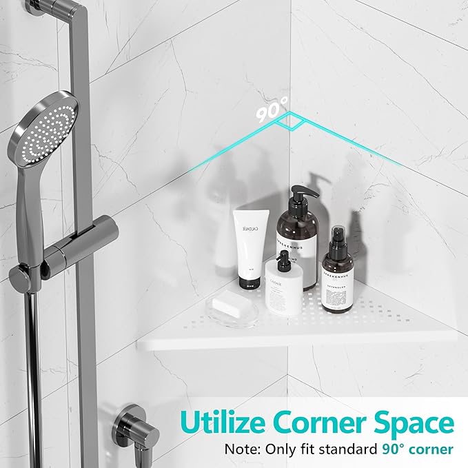 - 【Corner Bathroom Shelves】The dimension of each shower shelf corner is 12"D x 12"W x 0.6"H. Only works for 90 degree corner, and each tile shower shelf can easily hold your shower supplies up to 15bs.