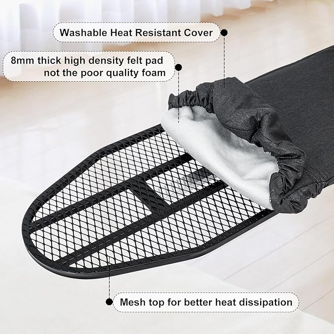 - Extra Cover Felt Padding:Comes with a 100% cotton material heat resistant washable cover(elastic cord design on the edge)and thicken felt padding not the inferior foam pad, thick enough, will not mark your clothes, to keep a good ironing experience