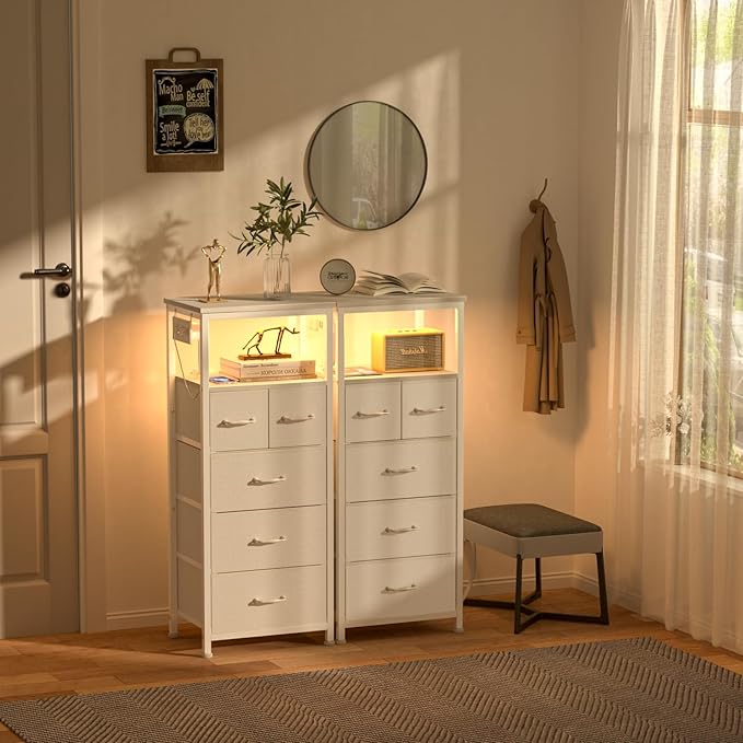 Furnulem Dresser for Bedroom, Tall Nightstand, Vertical Chest with Wood Top, Charging Station, LED Lights, 5 Fabric Bins, Bedside Table with Shelf, Furniture for Entryway (5 Drawer, White)