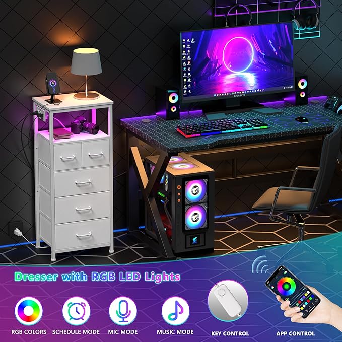 - 【Smart RGB LED】The storage organizer unit is equipped with RGB light strip, which can be controlled by button or mobile app. There are more than 60,000 colors of LED lights to choose from. There are also modes such as Style Mode, Music Mode, Microphone Mode and Timer Function for you to explore! You can freely set the brightness, color, mode that best suits your mood and environment, making the led dresser a great addition to your bedroom.