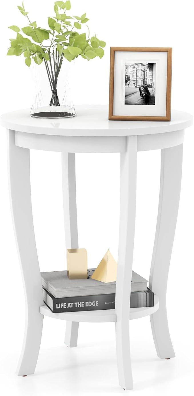 GOFLAME 2-Tier Round End Table, 18” Sofa Side Table with Storage Shelf, Floor Tea Table with Solid Wood Legs, Compact Nightstand for Small Space, Living Room, Bedroom, White
