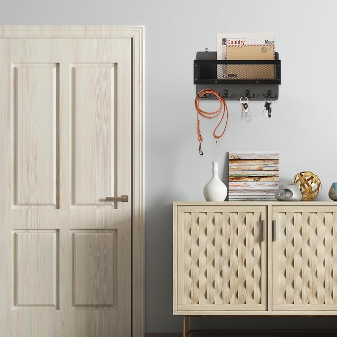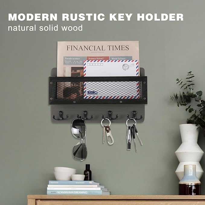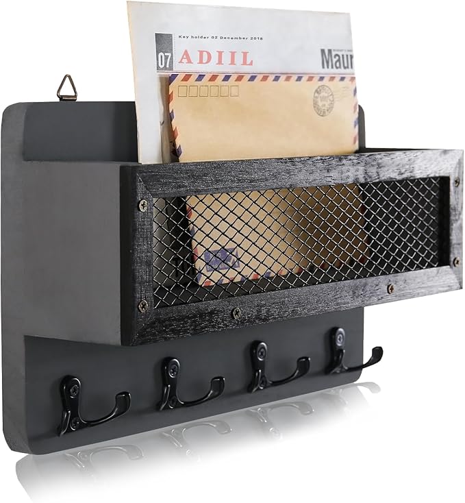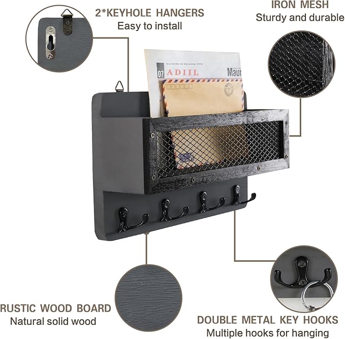 - Versatile Key Holder: The mail and key holder is equipped with four metal key hooks for keys, mails, sunglasses, masks, wallets, dog leashes, etc. The wall mounted design makes it a better use and space saving. No more losing keys or mails