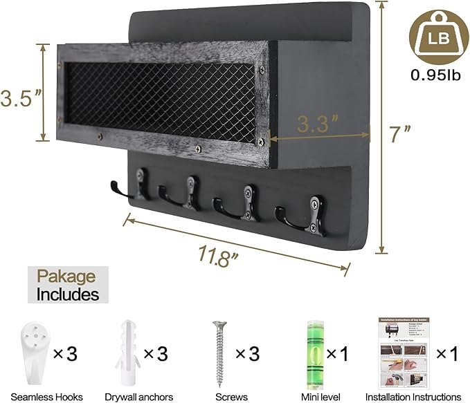 - Easy to Install: Perfect size: 11.8 inches L, 7.0 inches W, 3.3 inches H. No assembly is required. Comes with a mini level, installation instructions, seamless hooks, screws, and anchors hardware. With the instructions, you can install the key rack in minutes