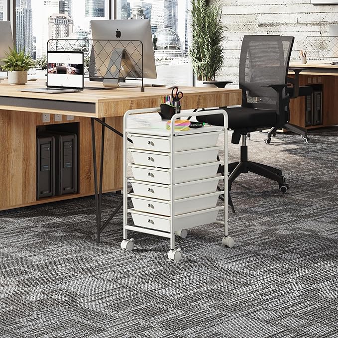 6-Tier Utility Cart with 6 Drawers, Rolling Utility Cart with 2 Lockable Caster Wheels, Multipurpose Mobile Rolling Drawer Cart for Office Bathroom Kitchen, Ivory White