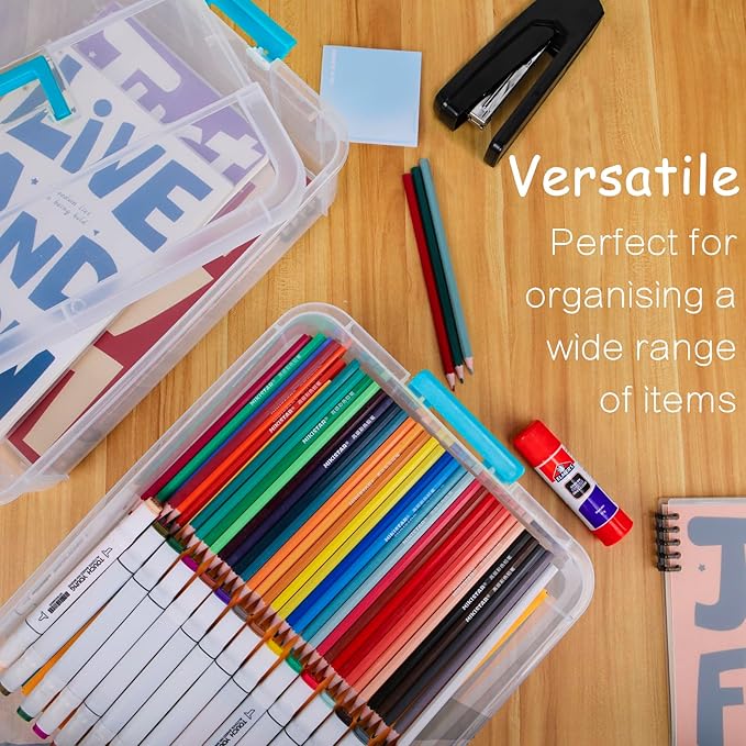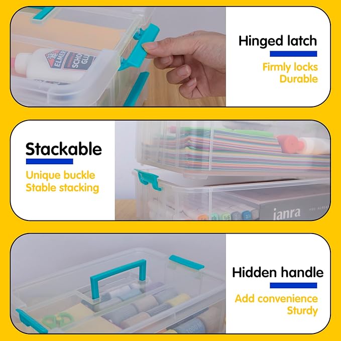 - Stackable & carry box- The hinged latch locks each layers firmly into place and easily separated or attached, while the recessed lid makes stacking more stable, allowing multiple bins to be neatly stacked together to save space. A sturdy grip handle on the lid provides ease in portability.