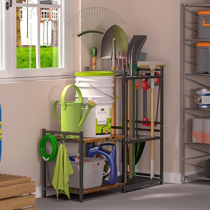 - 【Multi-functional Design】: The garden organizer seamlessly adapts to garages, gardens, sheds, and backyards. It efficiently organizes gardening, yard maintenance, cleaning, and lawn tools. From shovels and leaf rakes to bow rakes, mops, and brooms, it accommodates a wide range of tools with ease. The thoughtfully designed storage systems simplify organization, maximize space utilization, and improve work efficiency.