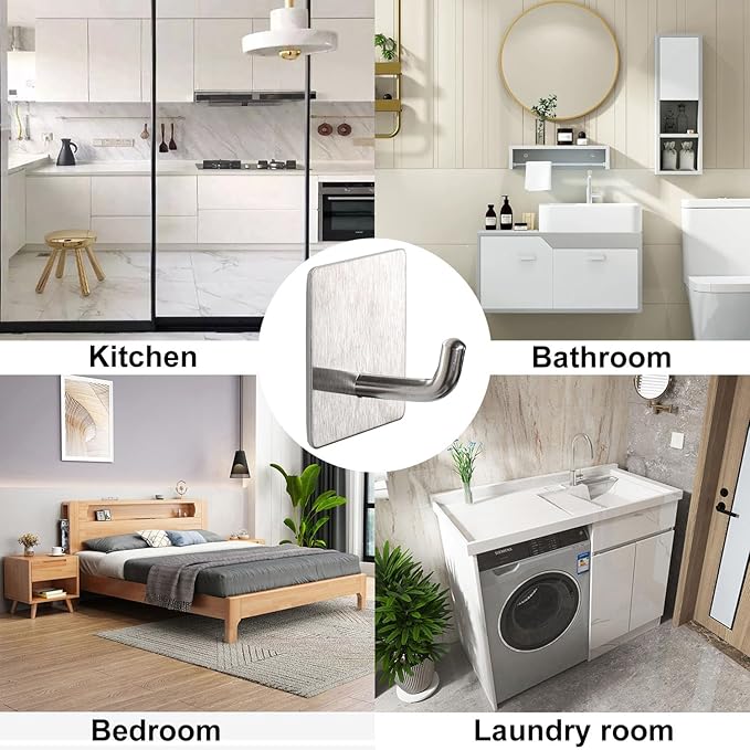 - PREMIUM MATERIAL: Adhesive towel hook constructed of SUS 304 stainless steel to prevent daily scratches, rust and corrosion. No need to worry about peeling or rusting after getting wet. Perfect for adding extra hanging places in your bathroom, kitchen,bedroom, laundry room, etc.