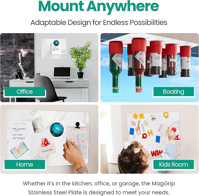 - Use Anywhere – Quickly turn any surface into a magnet board with this Stainless Steel Plate. The metal plate is easy to mount on walls, under your kitchen cabinets, on the inside or the side of cabinets and pantry spaces. Use it anywhere you need a magnetic surface!