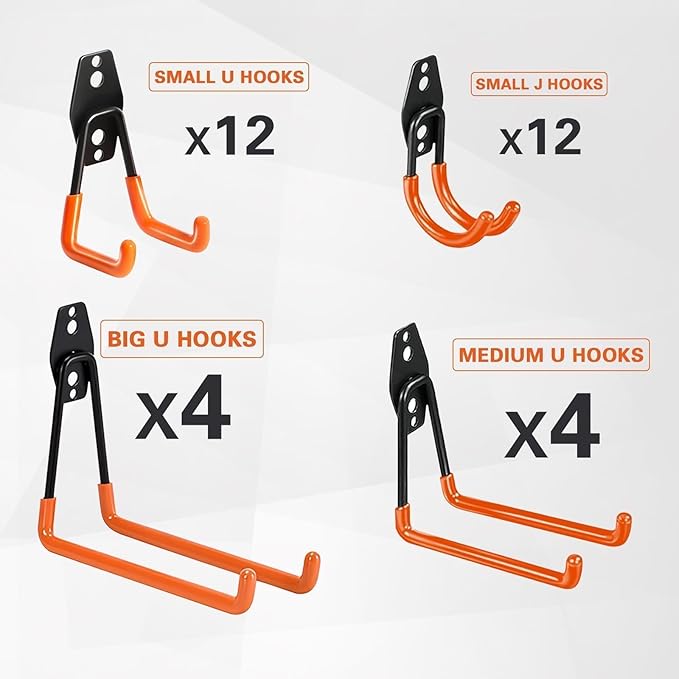 - 【Multi-Purpose Hooks to Meet Diverse Needs】GUDEMAY's wall hooks are not only suitable for hanging car tools, but also meet Jack's various outdoor sports needs. The small J-shaped hook is perfect for hanging bicycle helmets and gloves, the medium hook is used for hanging skis and surfboards, and the large square hook can steadily carry his large tool box. Now, his garage is not only neat and tidy, but also various items can find a suitable storage place, making it easier for him to find what he needs.