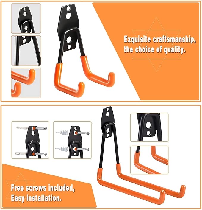 - 【Best Gifts Choice】 After completing the garage organization, Jack decided to give these garage heavy duty storage hooks as a gift to his good friend Paul. Paul is also a person who loves outdoor sports, and his garage also needs to be organized. When Paul received this gift, he was very happy. He found that these hooks are not only practical but also beautifully designed, which can meet his needs for storing various tools and equipment. He installed the hooks in the garage and found that the garage became neat and orderly. This gift not only solved his storage problem, but also deepened their friendship.