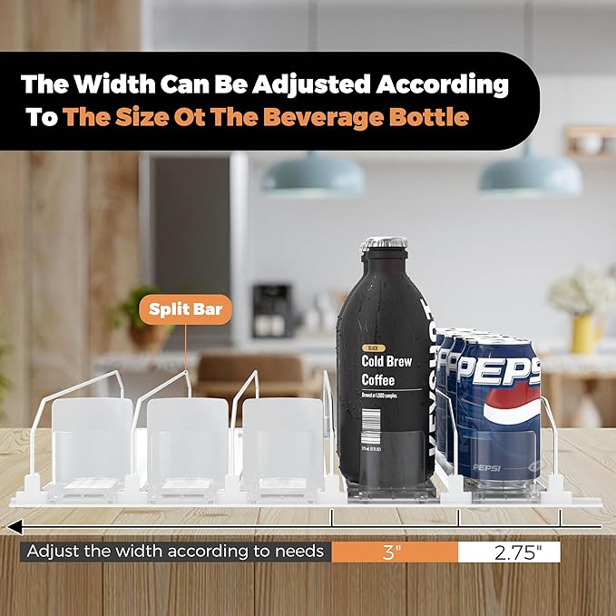 - Check Size First: This 15 inch drink organizer for fridge is suitable for most refrigerators. Please measure the length of the inner layer of your refrigerator before purchasing. One set contains 5 rows with accessories. Each row holds up to 5 cans. You can adjust the width to store bottles of different sizes.(Perfect for standard size 12oz~20oz)