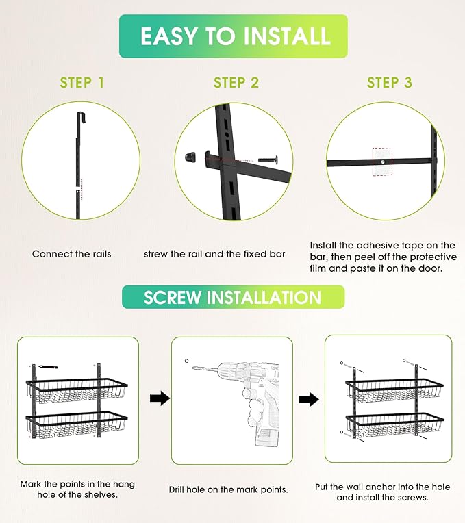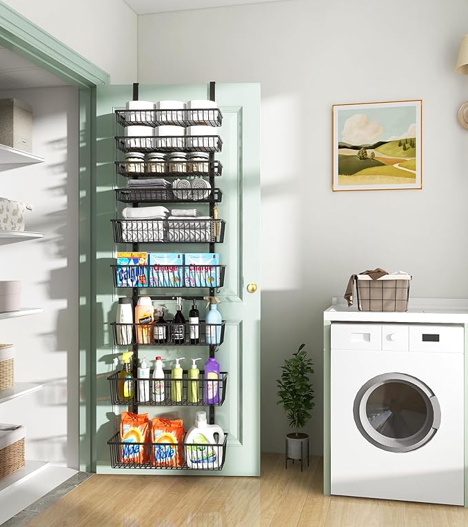 - Adjustable & Wall-Mounted: This over the door pantry organizer can be adjusted to accommodate items of different heights. You can easily nail this rack to your wall or door for a secure and sturdy fit. The rack also features 6 flexible hooks and 4 adhesive stickers, which help to prevent swinging when opening and closing doors. The full basket design also ensures that your items won't slide off the back of the rack.