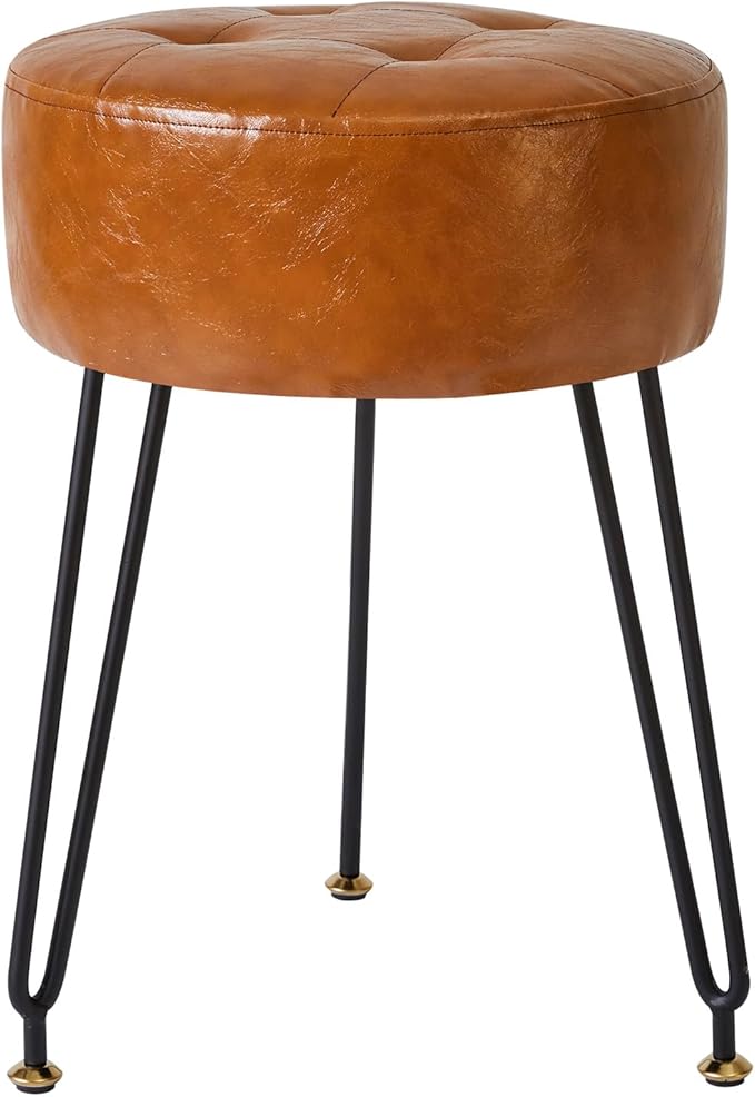 IBUYKE Faux Leather Round Footrest, Makeup Vanity Stool Side Table, PU Dressing Table Seat, Pouf Couch Stool, Golden Steel Legs, Light Brown LG-31J