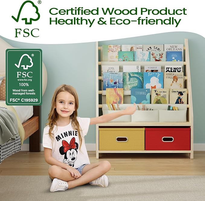 - Durable2-IN-1 LARGE STORAGE: Kids Bookshelf with Toy Storage Organizer is not only a kids 4-tier sling bookshelf rack, but also with 2 pcs, different color fabric drawer for toy storage organizer, got large capacity storage space. Kids, children and toddlers can storage books, toys, pens and anything they want, helps kids learn and practice organization and clean-up skills.