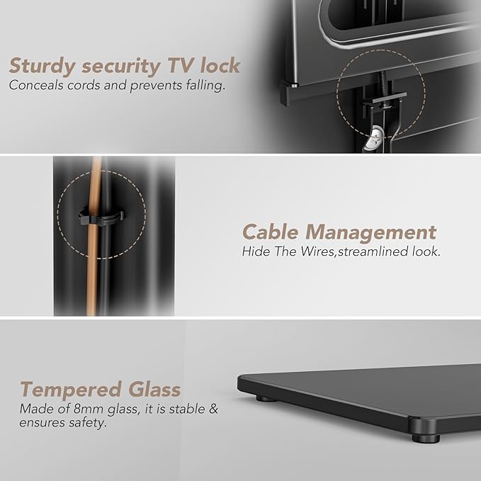 - SMART DESIGN ☞ This smart floor TV stand comes with 10mm solid tempered glass base that connects to a solid steel pillar which provides stable support for your TV that creates a modern look for your audio video equipment, it can hold up to 77lbs