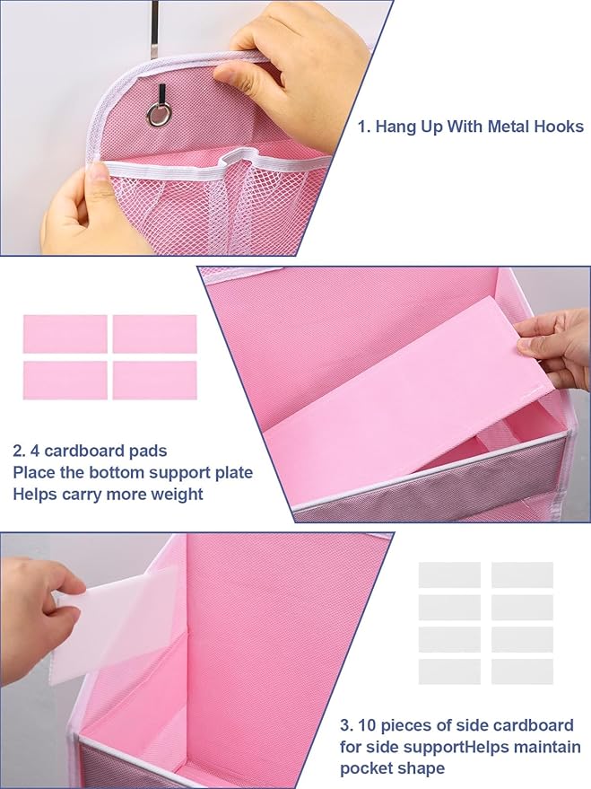 - Strong Construction & No Tilting Design - This hanging organizer is made of high quality non-woven fabric, which is breathable, solid and durable. 5 large pockets are reinforce with 2mm thick cardboard and fiberglas, and the enclosed sides joined together with the large pockets, plus with swing-proof hook & loop strips, making this dorm room essentials hold its shape and security, and ensures no moving/swaying even when you open or close the door