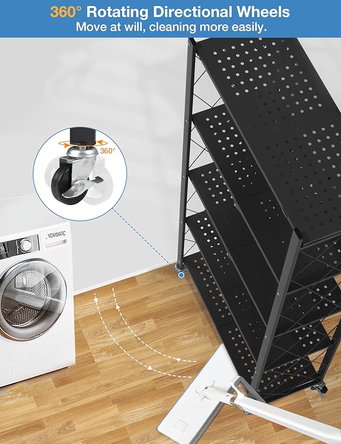 ALANNG 70.7" H Metal Storage Shelves, 5 Tier Folding Shelf on Wheels, Heavy Duty, No Assembly, Rolling, Collapsible Rack Unit for Kitchen, Basement, Pantry (Black,2 Pack)