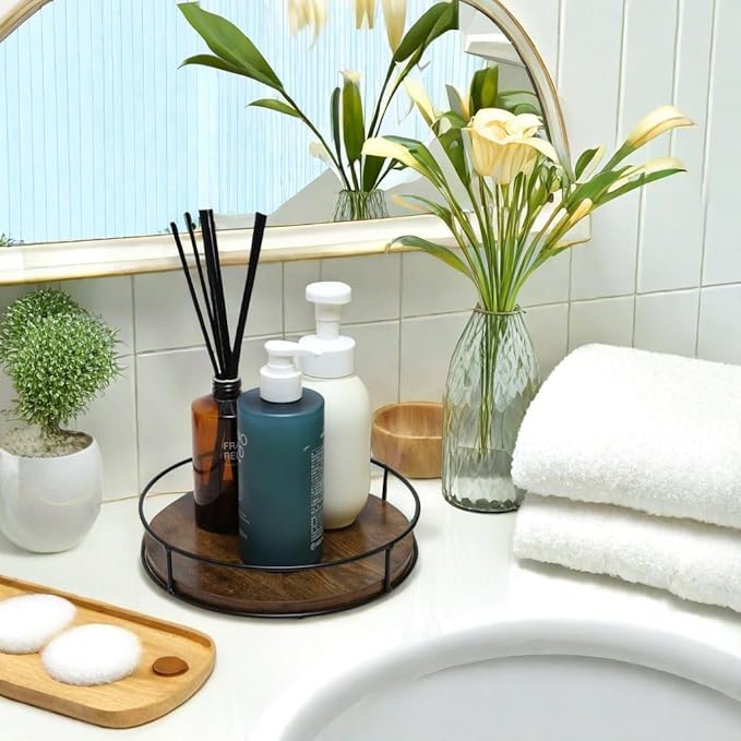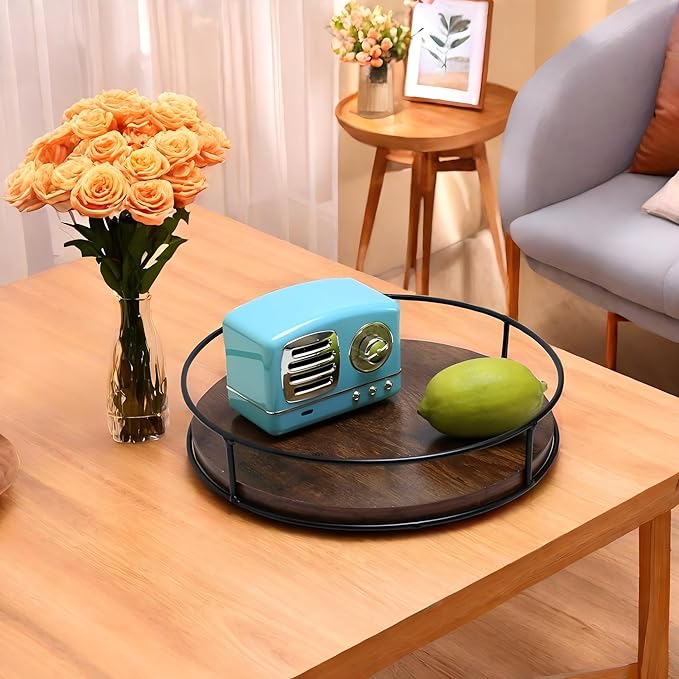 9 Inch Wood Lazy Susan Turntable for Table, Kitchen Rustic Brown Turntable Organizer with Steel Frame, 360 Degree Decorative Turntable for Countertop Cabinet or Centerpieces