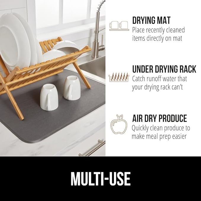 GORILLA GRIP Ultra Water Absorbent Microfiber Dish Drying Mat, 18x32, Quick Dry Thick Mesh, Slip Resistant Pad for Sink Dishes or Under Rack, Kitchen Counter Accessories, Machine Wash Mats, Gray