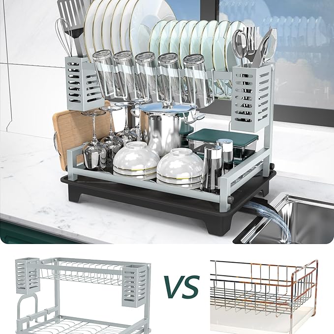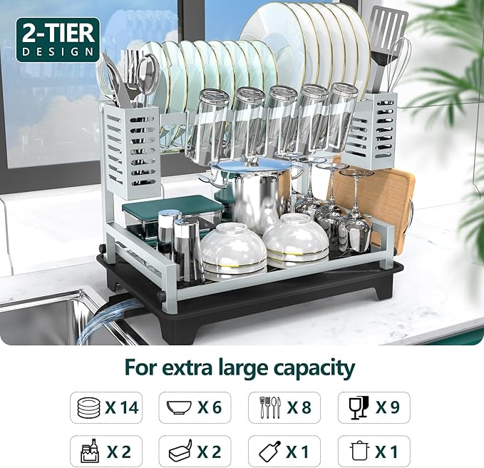 - SPACE SAVING: The top layer of 2 tier dish drying rack can store 14 plates and pots, the bottom layer can keep up to 20 bowls, the side 2 cutlery racks can hold various utensils, one side on holds 5 cups and another side can keep cutting boards. Keep your countertop clean and organized with our 2-tier dish drying rack.