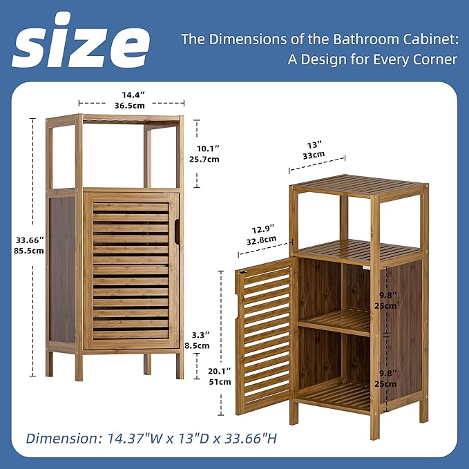 - DON'T WASTE BATHROOM CORNER SPACE - Compact and slim design, making full use of the vertical space, this bathroom cabinet can be placed in narrow corners and small areas to save more floor space for other furniture. Dimension: 14.37"W x 13"D x 33.66"H