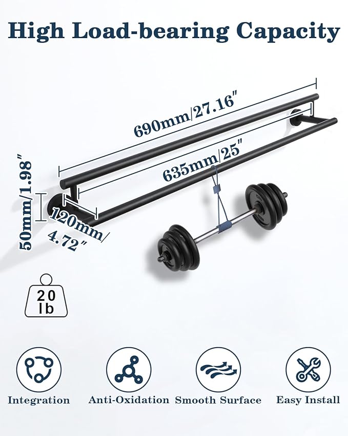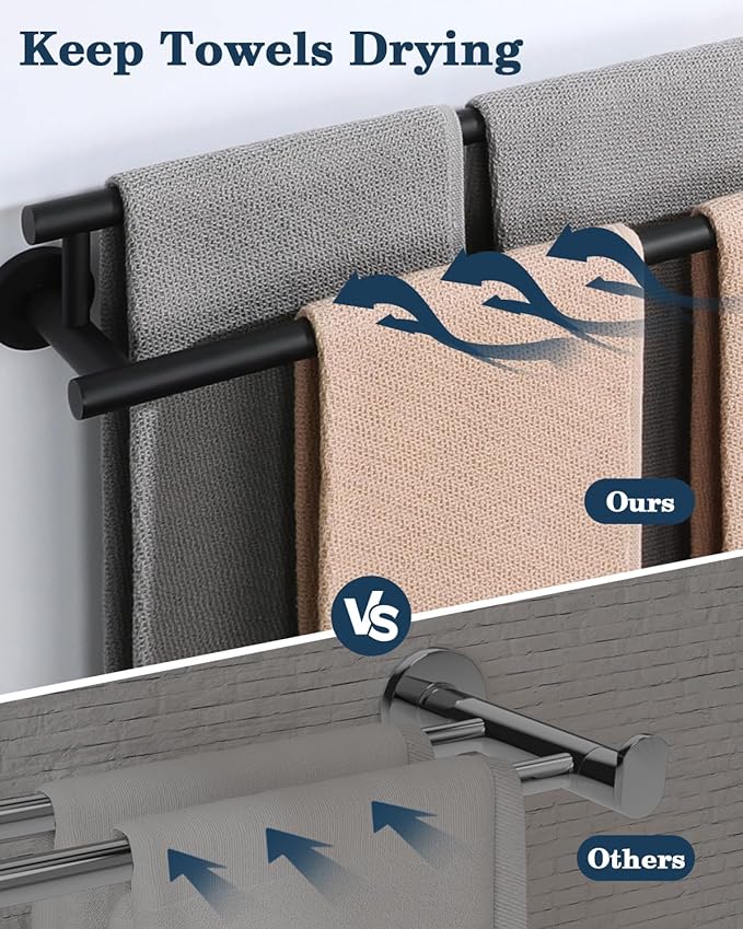 - 【Simple and Practical Design】This towel rack made of full round tube, generous and beautiful look, and unique up and down double bars design, perfect curvature to ensure that the towel can be easily hung on it, but also ensure the overall aesthetic and practical