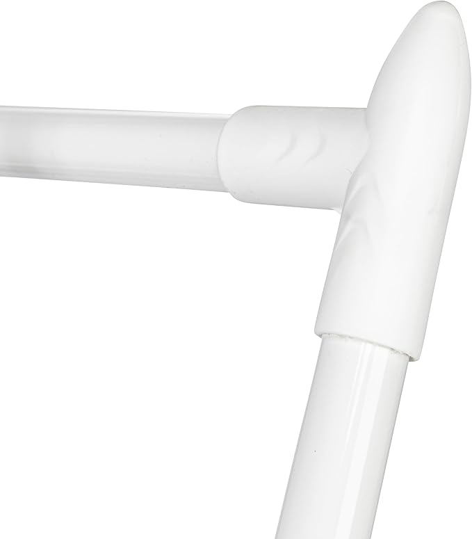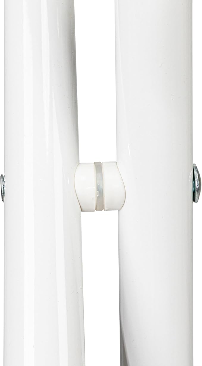- Features a metal X-frame with 2 hanging bars and a white finish.