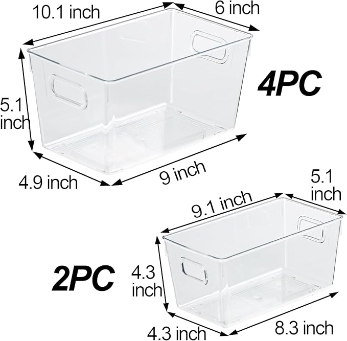- 6 Pack Clear Plastic Storage Bin: The package includes 6 plastic storage bins, 4 medium+2 small, each medium measuring 10.2×5.9×5.1 inch / 26×15×13cm. Small measures 9.4×5.1×4.3 inch/24×13×11cm.