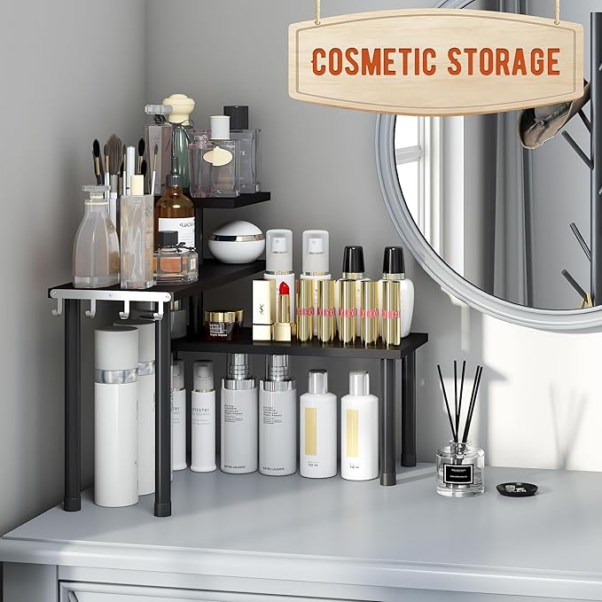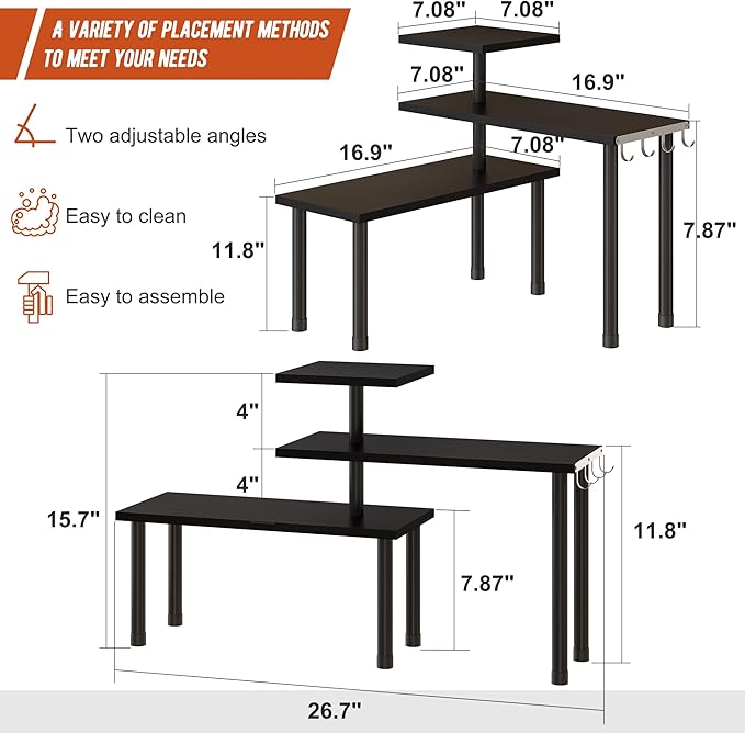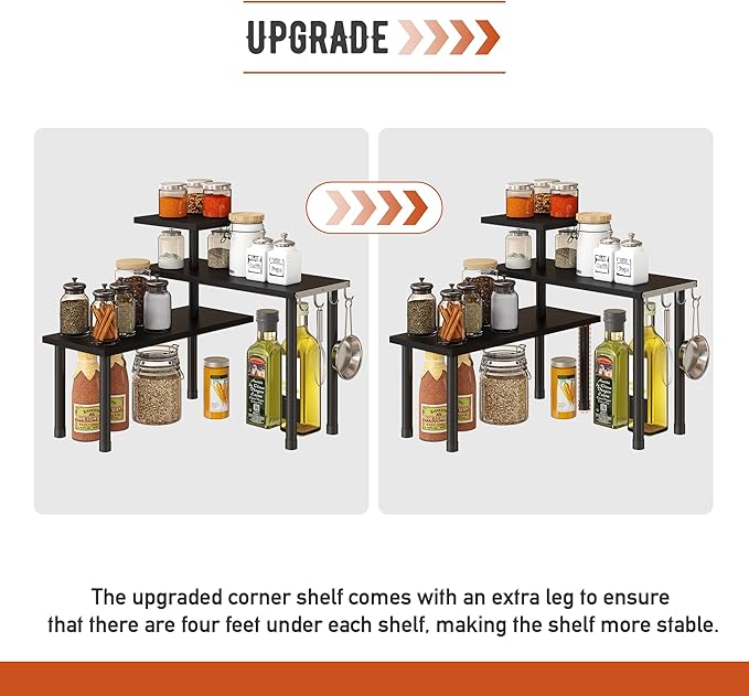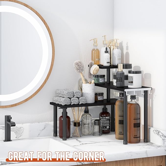GHWIE Corner Shelf Organizer, 3 Tier Bamboo Kitchen Countertop Rack for Living Room, Office, Bookshelf Display Shelves, Space Saving Storage Shelves,Black