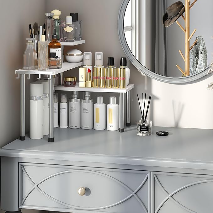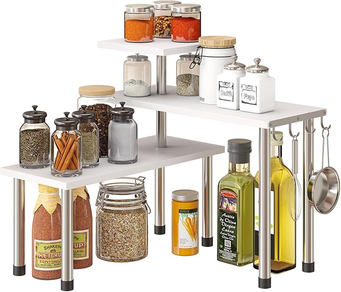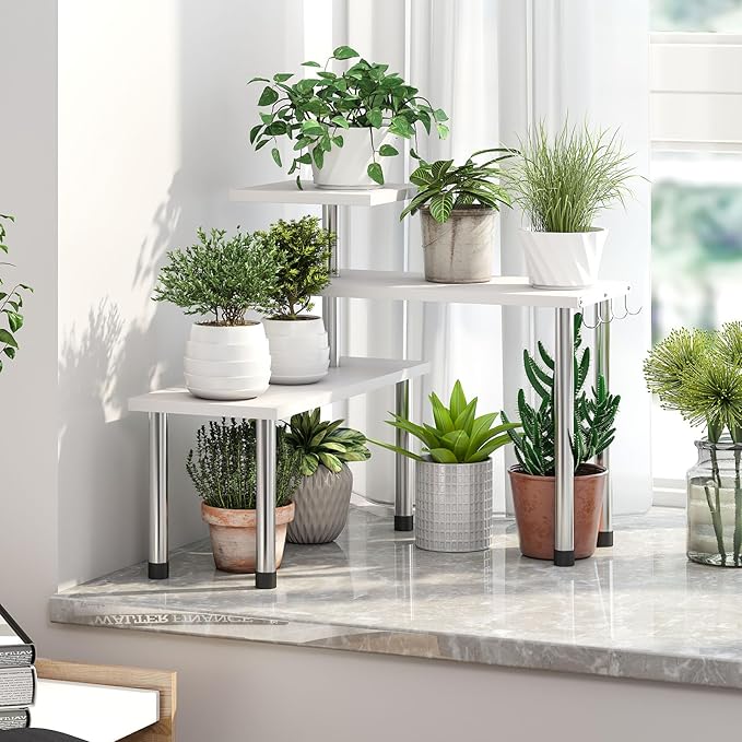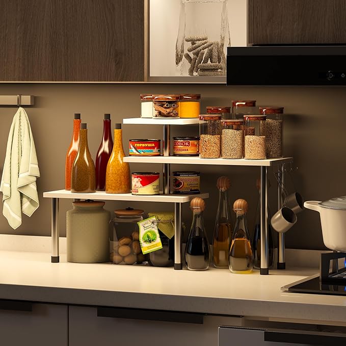 GHWIE Corner Shelf Organizer, 3 Tier Bamboo Kitchen Countertop Rack for Living Room, Office, Bookshelf Display Shelves, Space Saving Storage Shelves,White