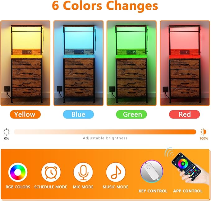 - 【LED Nightstand】: The tall bedside table has 6 RGB LED colors, adjustable brightness, three modes, push-button control or cell phone control; The vibrant lighting design of the bed side table adds a cozy, stylish and dreamy atmosphere to your bedroom decor.