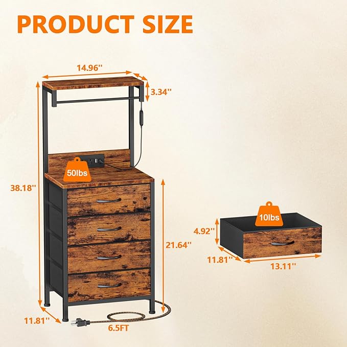 - 【Sturdy Tall Night Stand】: This night stand with charger station feature is made of high quality materials for durability. The overall frame is made of metal and the shelves are made of wood. The tabletop can hold up to 50 lbs. And each drawer can hold up to 10 lbs. 4 adjustable feet keep it level and prevent scratches on the floor.