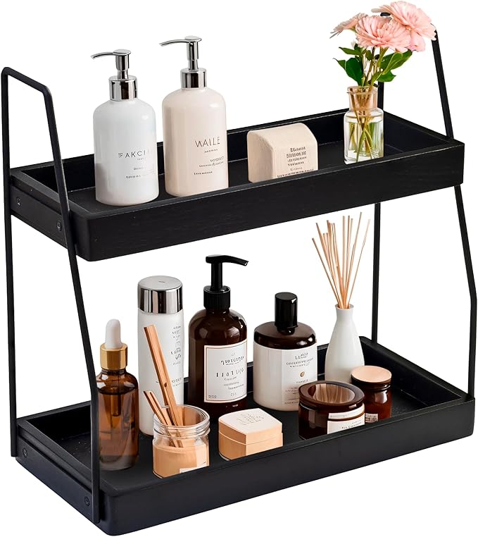 - Bathroom Counter Shelf in Black Finish: Our dresser organizer made from acacia wood and painted black, will be an addition that complements any house decor, ranging from modern and minimalist to traditional and eclectic. Black is a classic color that never goes out of style and is typically more forgiving when it comes to showing smudges, fingerprints, or minor scratches.