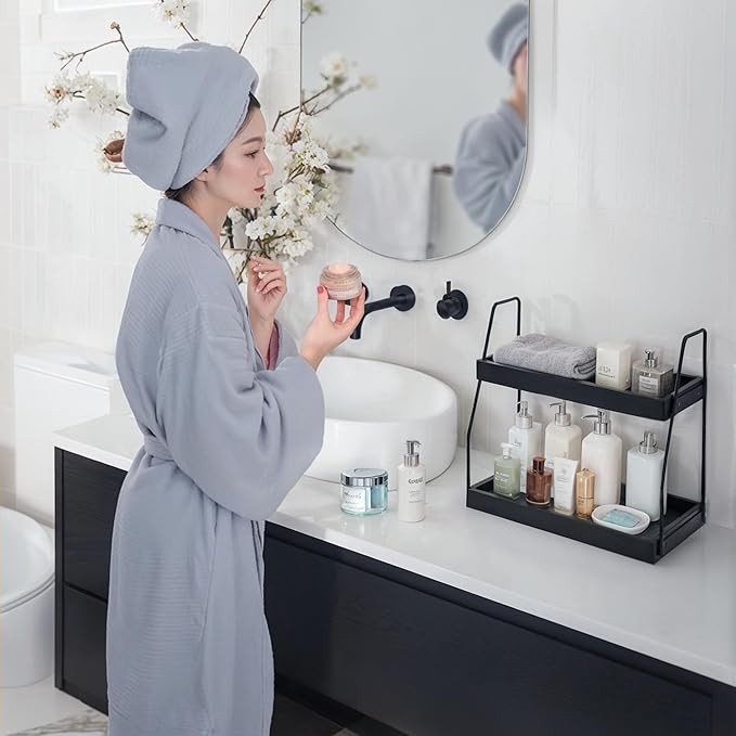 - Organize Your Vanity with this Convenient Shelf: This handy shelf offers 2 tiers, providing ample storage space. Each tier is wide enough to accommodate bathroom items such as Q-tips, cotton balls, skincare products, shampoo, and even a cube tissue box. Furthermore, the underside of the countertop organizer features 4 non-slip rubber pads that will keep the surface safe from scratches and prevent any sliding.