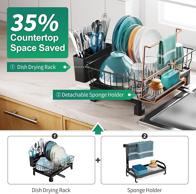 - Additional Sponge Holder Keeps Sink Tidy: Say goodbye to soggy sponges pooling water everywhere; The attached holder air-dries dishcloths and scrub brushes right over the drip tray; Water automatically drains into your sink through the smart runoff system so your counter stays spotless.