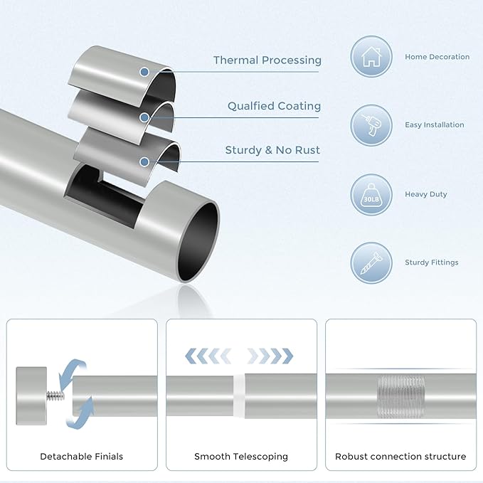 - 【 HEAVY DUTY CURTAIN ROD】Real heavy duty curtain rods, can hold up to 30 pounds. To work better with heavy curtains, in choosing materials for making curtain rods, we made the following three choices:1. We chose steel rod with 0.5% carbon content. This rod will be more sturdy and stable; 2. We chose the rod with 0.8mm thickness. Compared to other rods, ours are thicker and more durable; 3. We chose 1" diameter rod. After testing, 1" diameter curtain rod is the most reliable for windows in the range of 20-40 inch