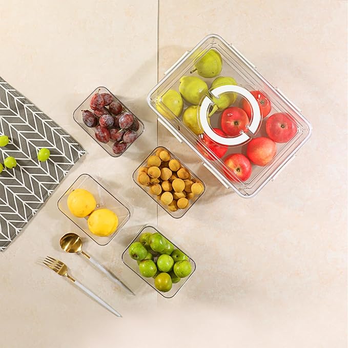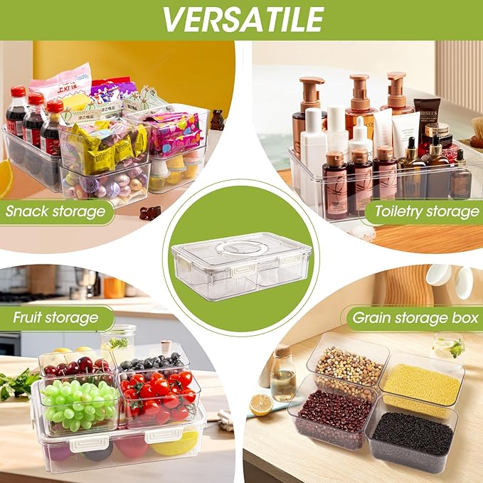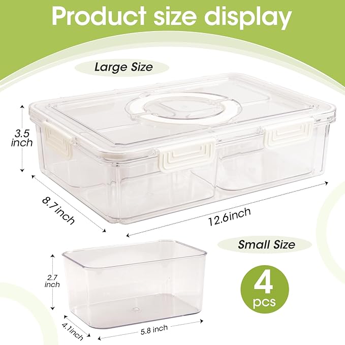 - Size Specification: The serving tray measures 12.6*8.7*3.5 inch. The size is designed to fit in most standard fridge. It allows for efficient use of the available space. It has four compartments, effectively separate different types of food